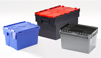 Distributiebakken met scharnierende deksel zijn slagvaste transportbakken, vaak met labelhouders en verzegelbare sluiting. De distributiebakken kunnen daarnaast genest worden in lege toestand.